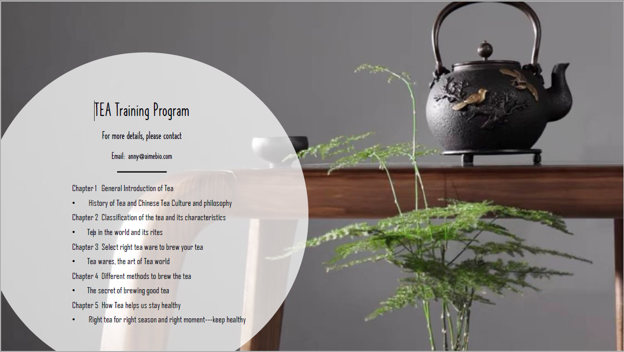 In order to help people to understand more about Chinese tea cultures and tea knowledge, to abtain or to improve the sensibility for the quality, Aimebio developped a special tea training program for high-end hotels & restaurants, as well as for individual tealovers.